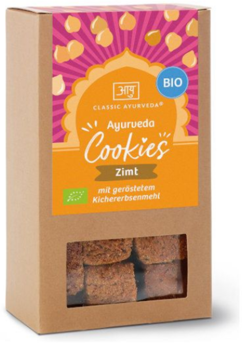 These organic Ayurveda cookies are made with traditionally roasted chickpea flour as the base. The recipe contains organic ghee from certified hay milk as well as a finely balanced spice blend of Ceylon cinnamon, orange peel, allspice, cardamom, ginger, nutmeg and mace. Chia seeds add texture and palm sugar adds a sweet taste. Due to the baking process, the cookies maintain their firm texture and are a great alternative to Ayurvedic snacks for travel.