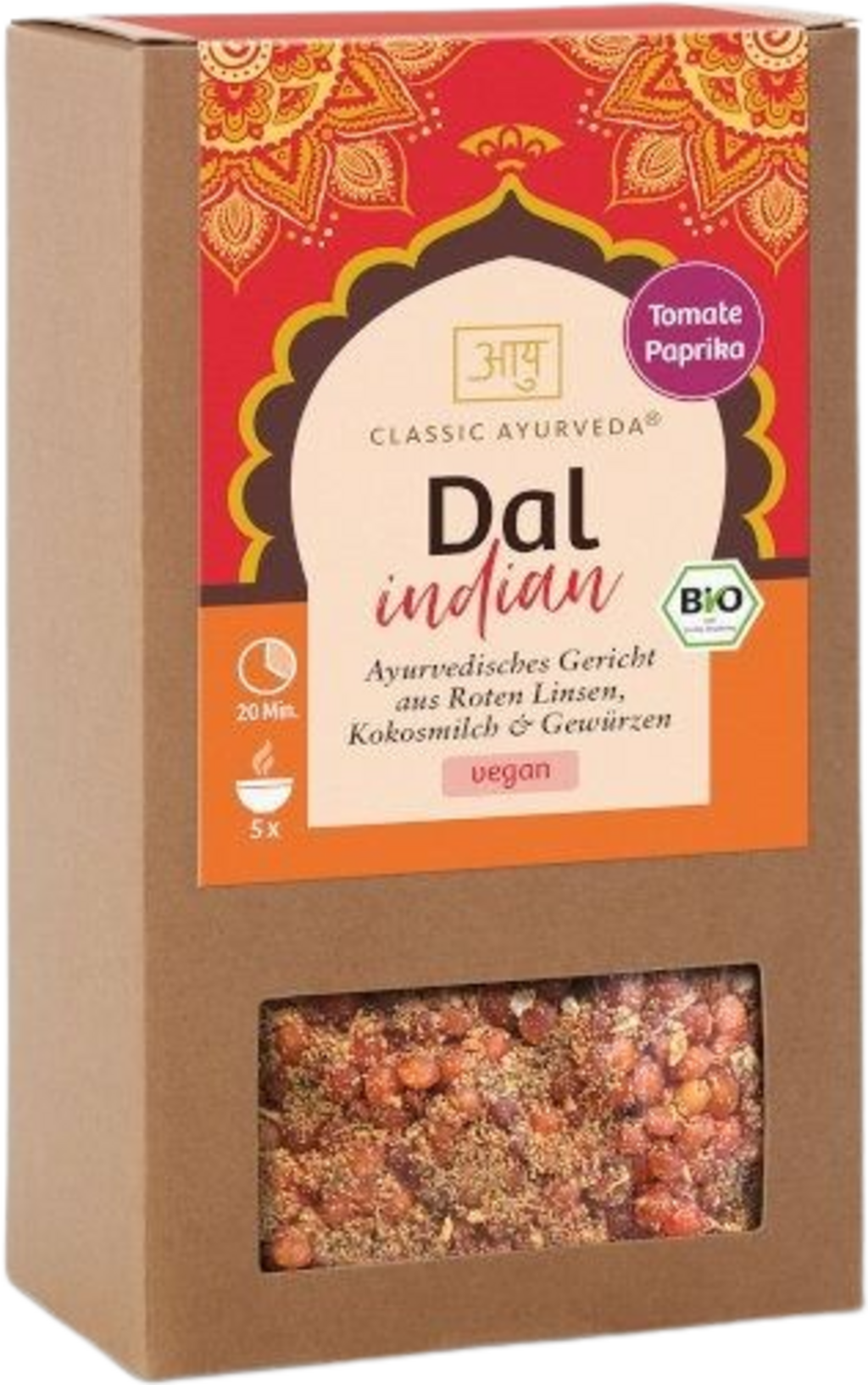 Experience the authentic taste of classic dal with this Ayurvedic ready-to-cook mix from Classic Ayurveda. Quick and easy to prepare, it is ready to serve in minutes. The base of protein-rich red lentils is complemented with coconut milk powder to give it a velvety, creamy consistency. Savoury tomatoes and onions are finely balanced with spices such as cumin, paprika, ginger, and chilli. The flavour profile is rounded off with rock salt, mustard seeds, chervil, and asafoetida to create a hearty, warming dish with a gentle touch of heat.