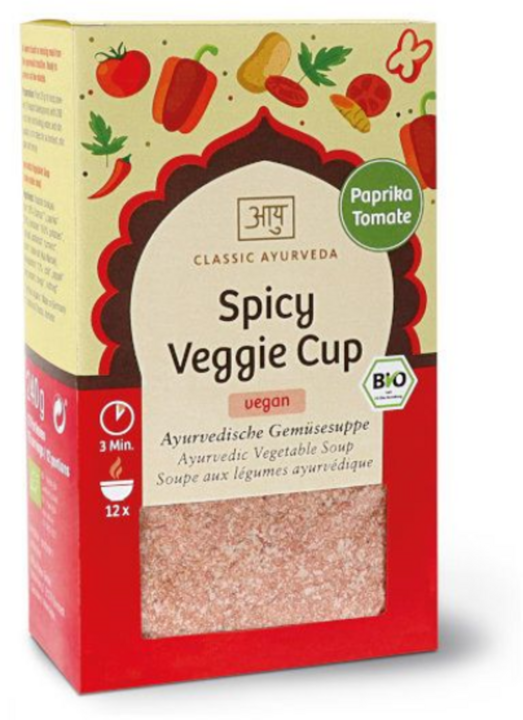 This organic Ayurvedic ready-mix is perfect to prepare a delicious and wholesome meal in minutes. The base of ground paprika (bell peppers), tomatoes and potatoes is supplemented by roasted chickpea flour (Tsampa). A finely balanced spice blend of chilli, pippali, turmeric and cumin adds a piquant note. The recipe also contains ashwagandha and lovage, and is completely free from palm oil, added sugar or artificial additives. All ingredients are sourced from controlled organic cultivation and support a mindful diet at home or on the go.