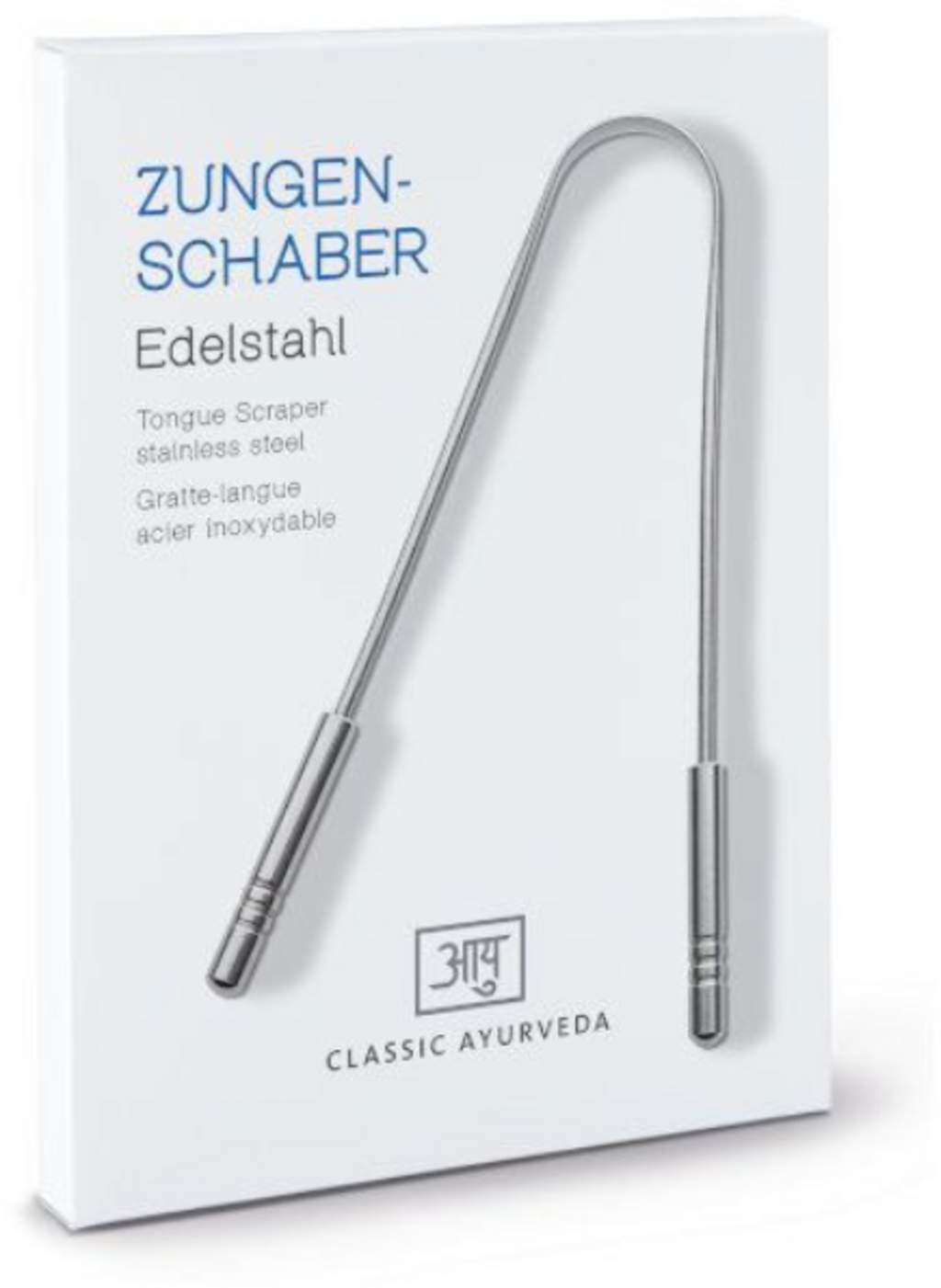 This tongue scraper is made from stainless steel and designed for long-term use as part of a daily routine. The tool features handles that allow for precise control when cleaning the surface of the tongue. In line with Ayurvedic practices, it is used to mechanically remove morning build-up from the tongue. The robust and sturdy tongue scraper retains is shape and supports your daily oral care and hygiene routine.