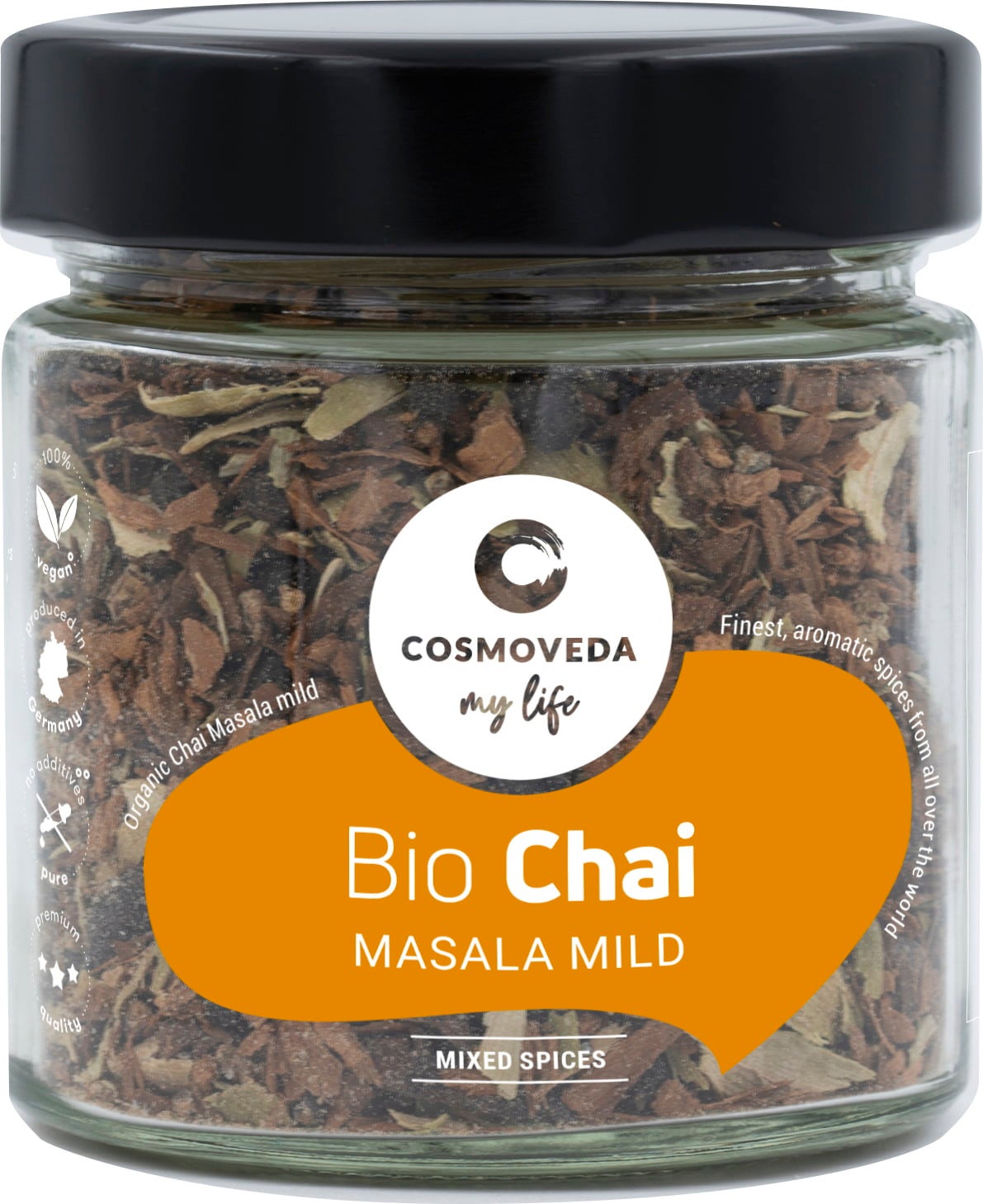 COSMOVEDA's Mild Chai Masala contains delicious Indian spices such as cardamom, ginger, cinnamon and cloves, ideal for the preparation of Chai, the delicious milky Indian tea.