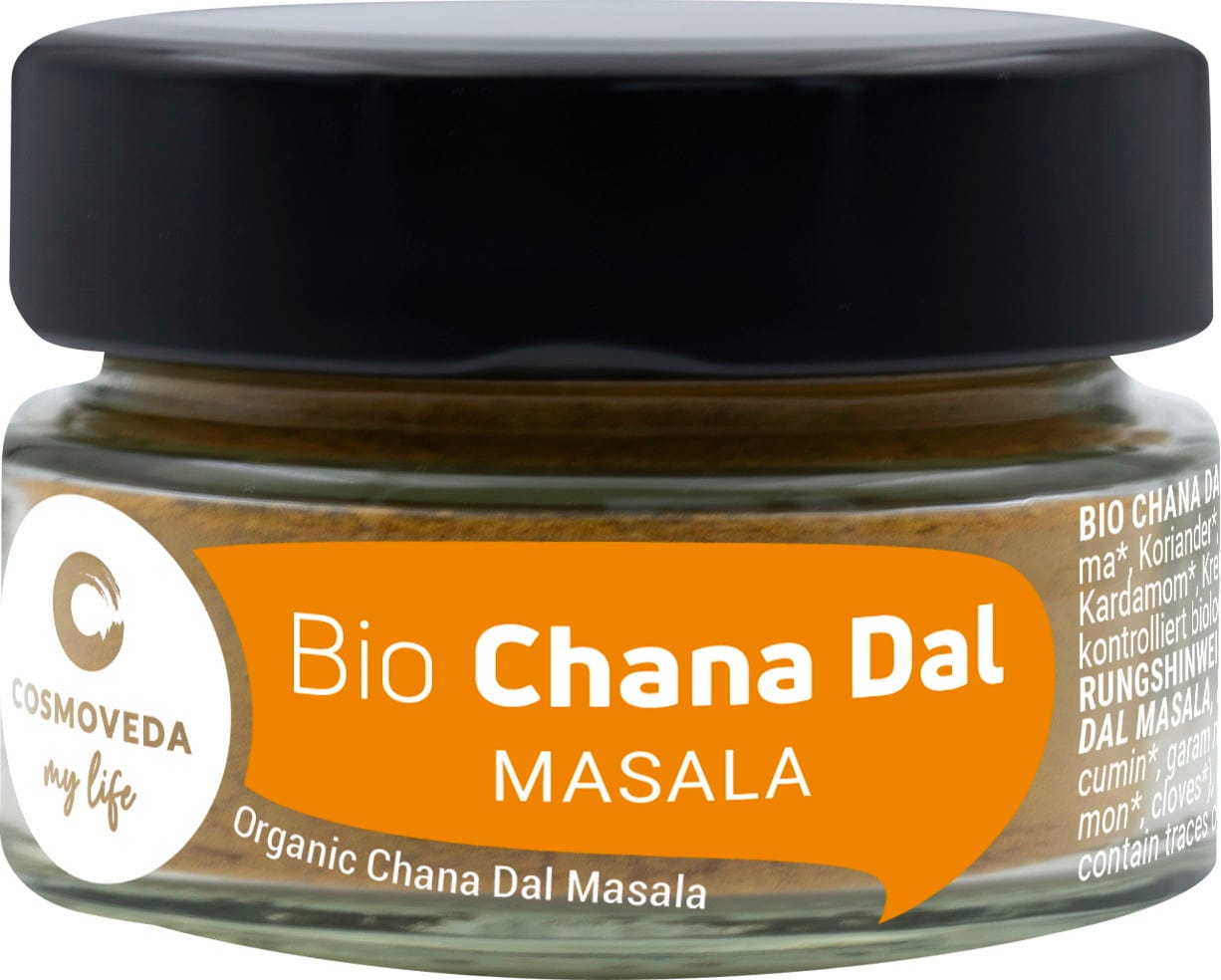 COSMOVEDA Organic Channa Masala Dal, a specially formulated Ayurvedic blend of fine spices for delicious and easily digestible Channa Dal dishes.