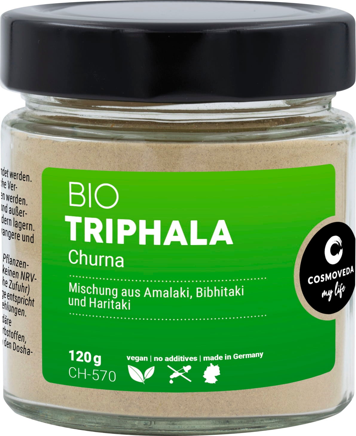 The organic Churna Triphala blend contains powder from the fruits of the Indian gooseberry plant, fruit powder from the Bellerian myrobalan plants and fruits from the great myrobalan plant.