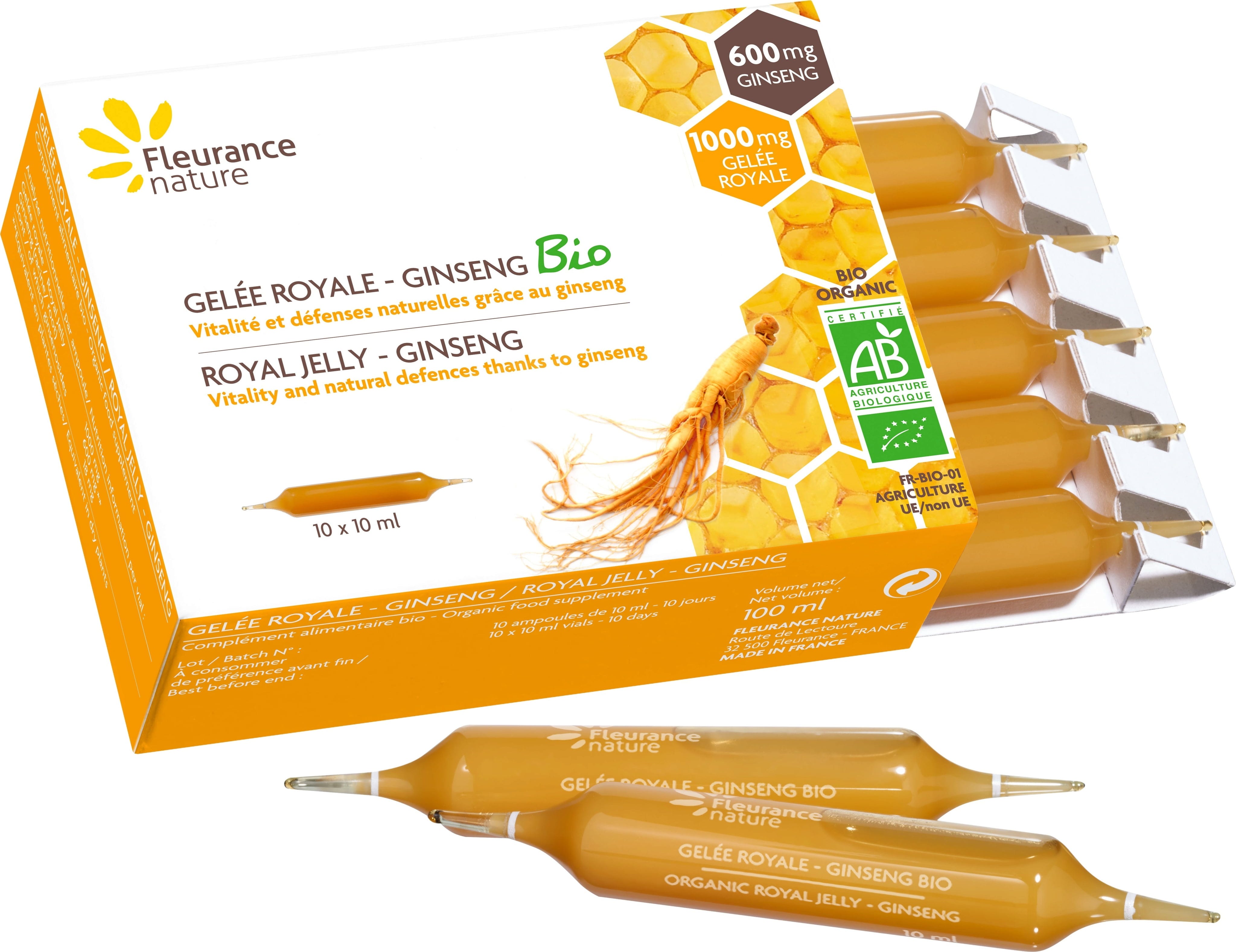 Fleurance Nature Organic Royal Jelly - Ginseng, 10 Ampoules