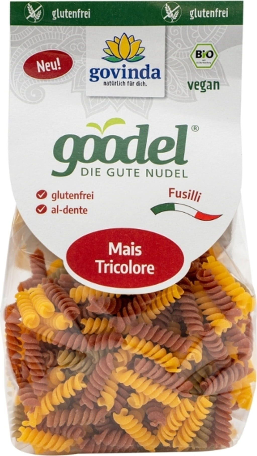 Govinda Goodel Fusilli Tricolore add vibrant colour to your plate. This organic pasta is made from maize flour and naturally tinted with beetroot and spinach for its distinctive three-colour appearance. Enriched with a portion of quinoa flour, it delivers a classic al dente texture and a mild flavour. A gluten-free option ideal for varied, wholesome family meals.