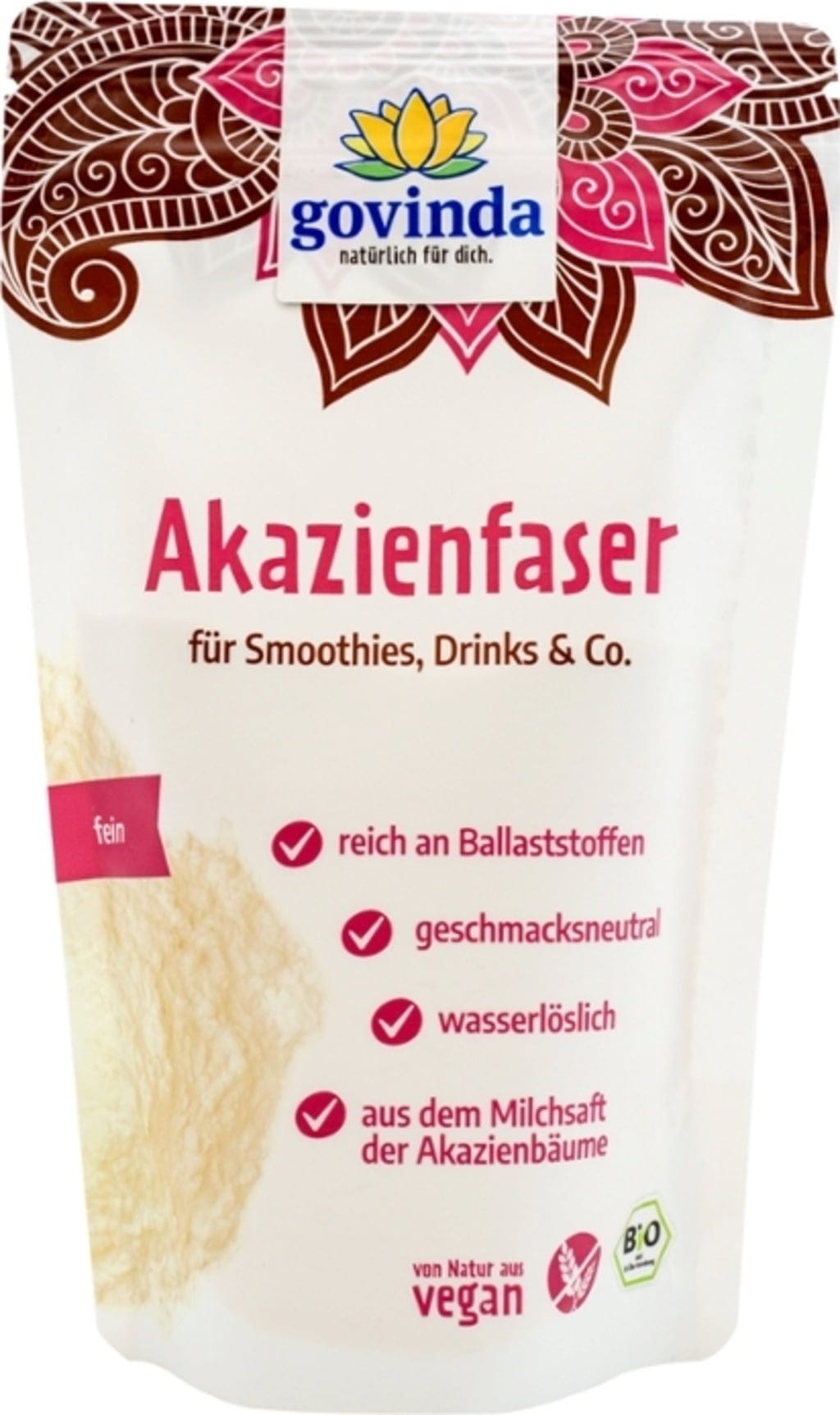 Govinda Organic Acacia Fibre is obtained by gently drying the natural sap of wild-growing acacia trees. The fine, neutral-tasting powder blends effortlessly into drinks, smoothies or your daily muesli. As it consists of water-soluble fibre, it does not alter the texture of your food or beverages. A high-quality supplement from certified organic cultivation, free from artificial additives.