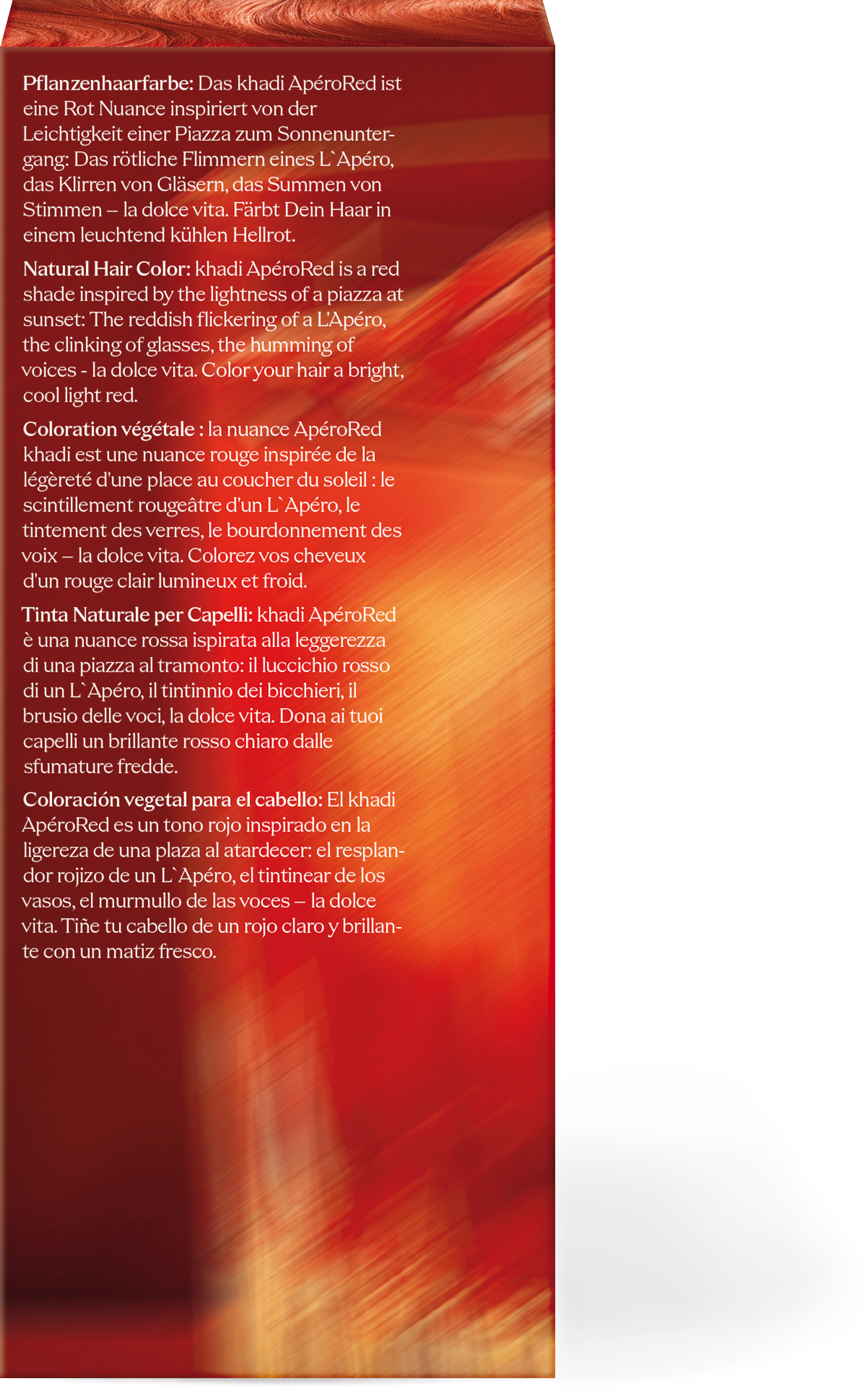 ApéroRed is like the red and gold glitter of an aperitif at sunset. It is reminiscent of the clinking of glasses, the cheerful murmur of voices and the warmth of the sun - it is khadi's homage to the Italian dolce vita and offers a fascinating interplay of deep, sun-loving red tones and elegant, cooler light red nuances. Depending on the initial hair colour, the transformation begins within 48 hours and ApéroRed unfolds a magical depth. The luminous warmth gives way to a cooler, more elegant red that shimmers gently and subtly - as if the evening sky has turned from fiery orange to a moonlight crimson.